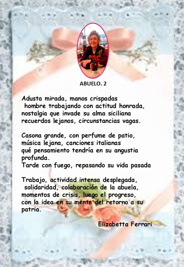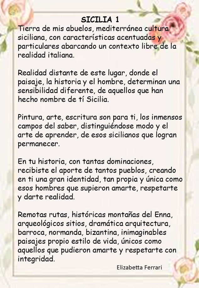 Para quienes deseen disfrutar de un tiempo de lectura y sensibilidad, reflejo del Universo interior de Elizabetta Ferrari, los Poemas completos se encuentran en la subpágina (Poemas)